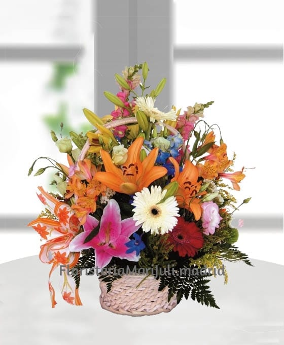 A una Cesta de Flores, se le puede adjuntar algún complemento de los que ponemos a disposición de nuestros clientes en Floristería Mari Juli. Puede ser; cerámica, jarrón, peluche, bombones…