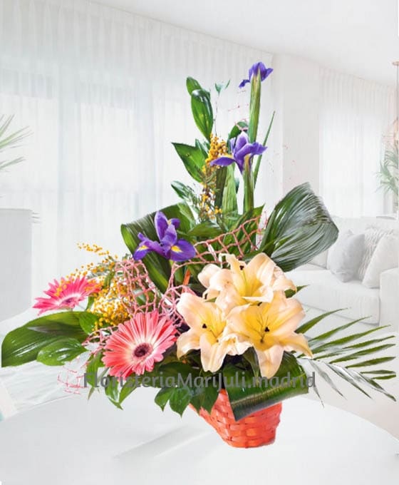 Con diseño, pero a la vez alegre, es esta Cesta Flor Somalia, compuesta por bonitas flores como es el lilium oriental, los iris, la gerberas, decorado todo ello con las elegantes hojas de aspidistra y más verdes variado, todo ello apoyado en una cesta de mimbre. Es el regalo perfecto si hoy queremos sorprender a una persona querida.