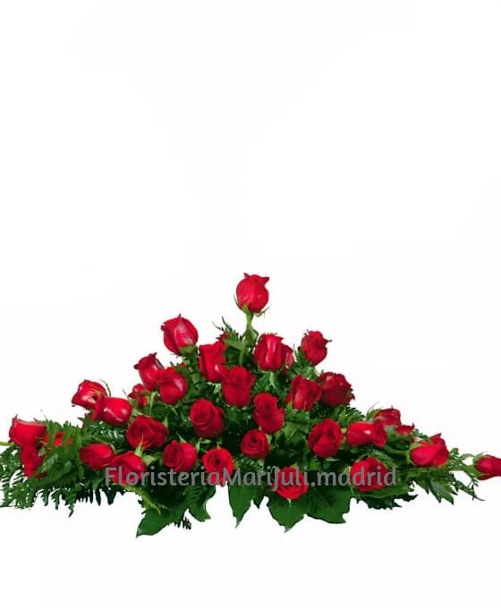 Las rosas son flores muy bellas. Las rosas rojas, con las que hemos creado este centro, se combinan a la perfección con las ramas verdes que la rodean, creando un centro funerario de rosas muy armonioso.
