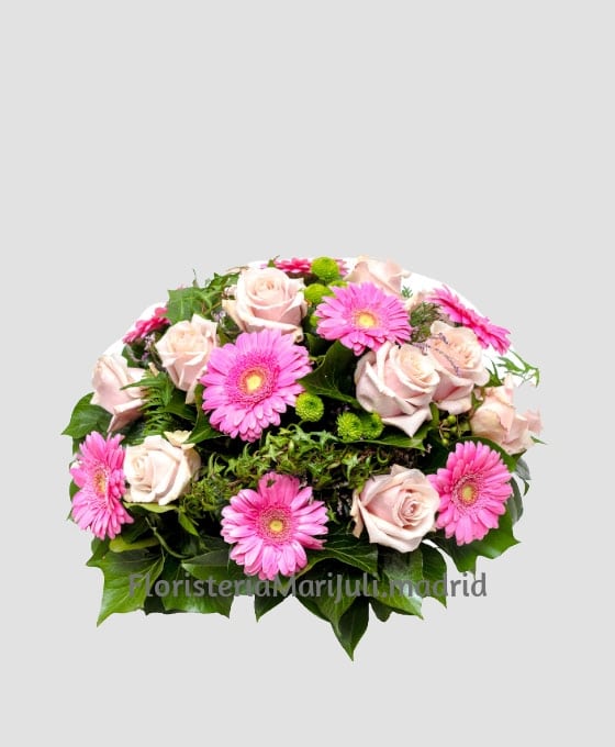 Bonito y elegante, este Centro Funerario Gerbera Rosa. Es un centro de flores para tanatorio, de flores para difuntos variadas, en tonos rosados, confeccionado con rosas, gerberas, margaritas de botón verde y verdes variados que le dan al centro un toque dulce y delicado. Nuestros centros de flores para fallecido se envían a los Tanatorios como muestra de cariño, aprecio y acompañamiento para la familia de la persona fallecida. Este centro de flores para funeral es un producto de total calidad, con flores frescas suministradas todos los días por nuestros proveedores, tanto nacionales como internacionales. Por lo que lo elaboramos lo más parecido posible o a gusto del cliente. Nuestros trabajos de flores para funeral, están siempre realizados con flores para difuntos y verdes de primera calidad. Estas flores para entierro son suministrados tanto por proveedores nacionales, como internacionales. Son centros de flores para fallecido efectuados de forma totalmente artesanal por nuestros floristas. Somos floristas profesionales, formados, por lo que su centro de flores para tanatorio quedará bonito y elegante.