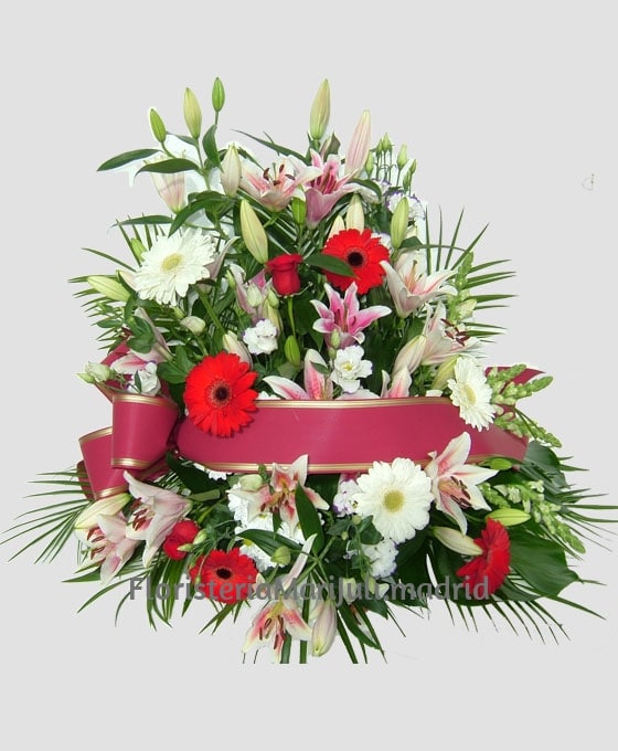Elegante Centro Piramidal Premium. Está compuesto por una base con liliums, gerberas rojas, rosas, claveles y adornadas con verdes espectaculares (8 liliums, 8 gerberas, 2 rosas, 6 claveles, 4 antirrihinums, verdes variados, esponja y cinta funeraria). Este centro de flores para difunto, está realizado con el mayor cuidado para hacerlo elegante y especial. Es un arreglo floral para momentos muy delicados. Nuestros centros de flores para funeral, están siempre realizados con flores y verdes de primera calidad y nos lo suministran tanto proveedores nacionales, como internacionales. Nuestras flores para funeral están efectuadas de forma artesanal por nosotros. Somos floristas profesionales, expertos en el arte floral funerario, por lo que su centro de flor para difunto quedará bonito y elegante. Si quiere enviar enviar flores al tanatorio nuestras flores para difuntos son la mejor opción.