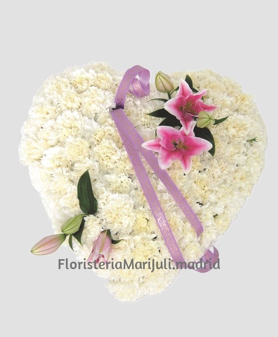 Fino y elegantes es este Corazón Funerario Clavel y Lilium, realizado con flores para tanatorio, Este bonito corazón, está decorado con claveles y liliums y bonitos verdes variados fúnebres y bonitos verdes variados. Es un corazón de flores blancas, especialmente elegante y bonito. Nos indica el amor que se siente hacia la persona querida fallecida.