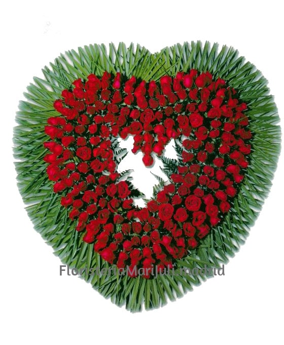 La corona fúnebre de rosas es un clásico de este tipo de coronas. Realizamos esta corona funeraria en forma de corazón con rosas rojas de la mayor calidad para una creación elegante y solemne. El verde que la rodea resalta el brillo rojizo de los pétalos de las rosas.