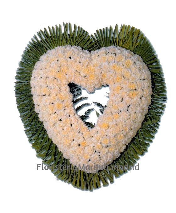 Una corona funeraria que es un símbolo de duelo con una forma original es ésta en la que la base de claveles blancos toma forma de corazón en memoria de la persona fallecida. Su color realza gracias a las ramas verdes que la rodean y es perfecta para incluir una banda en su centro.