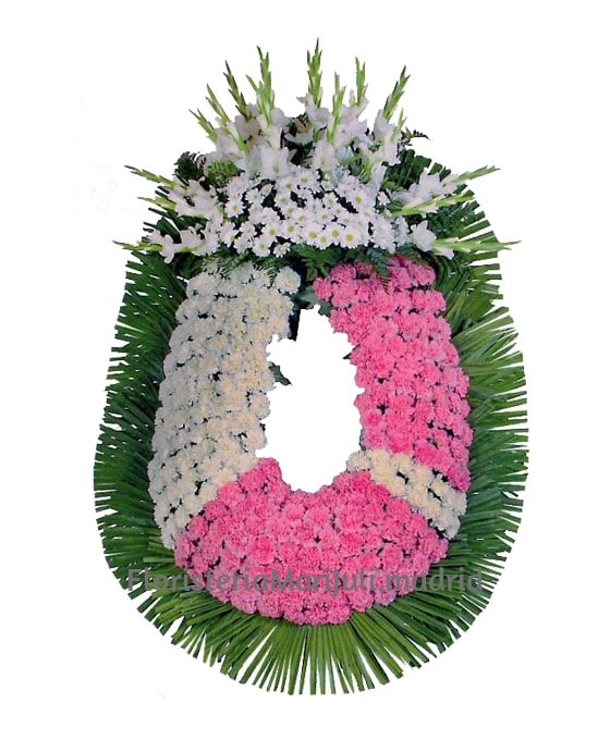 La corona funerarias de claveles rosas y blancos es muy elegante, ya que combina la belleza natural de esta flor con las margaritas y los ligeros toques de verde, con un resultado muy armonioso.