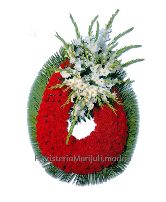 Esta corona fúnebre está realizada por una selección de claveles rojos, que le dan un toque llamativo a la par que elegante, gracias a su clásico diseño. Los toques de blanco y de verde realzan su elegancia y armonía.