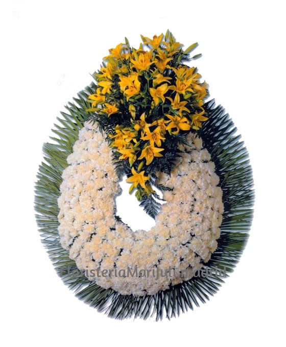 La corona funeraria de narcisos y claveles es muy elegante: la base de claveles blancos se realza con la presencia de los narcisos amarillos. El conjunto esta resaltado con el verde que los rodea.