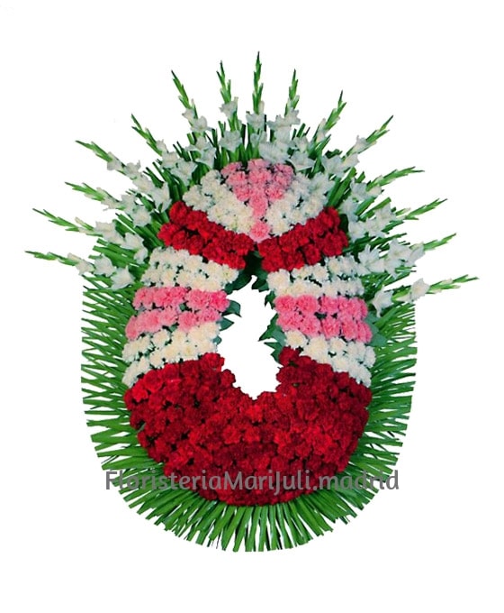 Corona funeraria realizada con claveles frescos de primera calidad en la que predominan los rojos y los verdes, lo que la convierte en muy elegante.