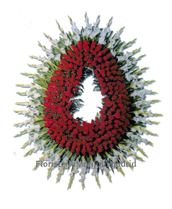 La corona fúnebre especial de rosas es un clásico para expresar sentimientos de pésame. La que creamos en Mari Juli es una base de rosas rojas de gran frescura y calidad, cuya belleza se realza gracias a las flores blancas y las ramas verdes que la rodean.