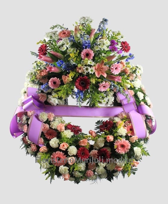 Bonita, exclusiva y diferente nuestra Corona Funeraria Primaveral de tu floristería. Toda ella compuesta de Flores para Tanatorio Urgentes variadas de colores diferentes: gerberas, rosas, lilium, antirrhinum, margaritas, claveles y solidago, todo ello salpicado de bonitos y finos verdes (Aro de 70-80 cm., con 1 cabezal, 15 gerberas, 6 liliums, 9 antirrhinum, 10 varas de margaritas, 15 varas de solidago, 65 claveles con verdes variados y cinta funeraria). Si quiere entregar flores al tanatorio, puede optar a nuestro servicio de envío urgente.