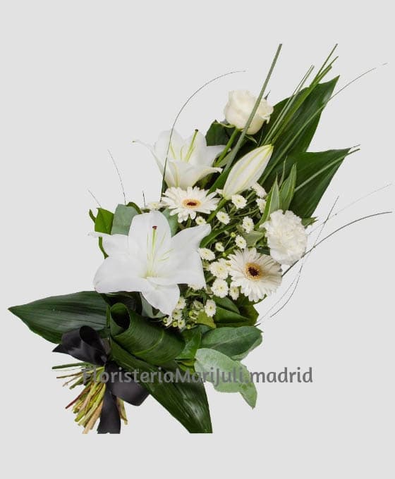 Bonito y fino Ramo Funerario Blanco Detalle Flor. Es un ramo funerario de flores variadas, flores blancas para dar el pésame, confeccionado con rosas, gerberas, claveles, lilium y verdes variados que le dan al ramo funerario un toque dulce y delicado (incluye 1 Rosa, 1 gerbera, 3 lilium, 7 varas de margaritas, verdes variados, celofán, lazo y cinta funeraria). Este ramo de flores en tonos blancos para funeral es un producto de gran calidad, con flores para difuntos variadas frescas suministradas a diario por nuestros proveedores, tanto nacionales como internacionales. Por lo que lo elaboraremos lo más parecido posible o a gusto del cliente. Nuestros trabajos de flores para difuntos, están siempre realizados con flores blancas para dar el pésame de máxima calidad y verdes variados