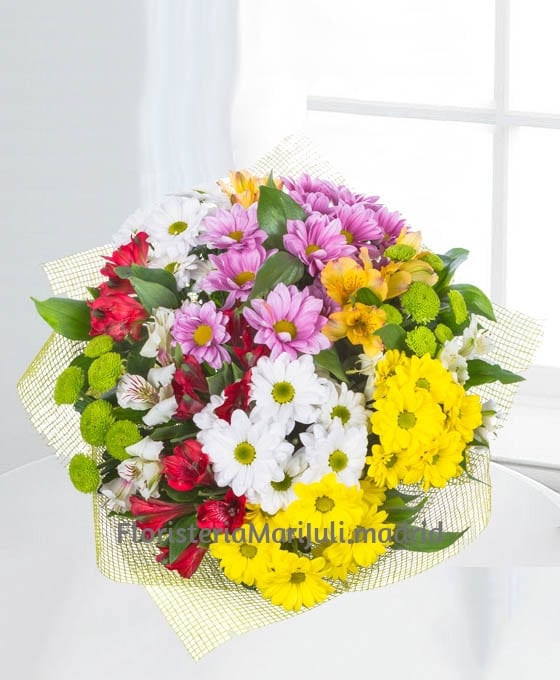 Alegre, bonito y fresco Bouquet Flores Berlín en tonos rosas, blancos, amarillos, rojos, blancos. Sin duda, si queremos alegrar el día a una persona es el ramo adecuado. Es un detalle bonito y especial que presentamos, elaborado con flores de regalo. Un poco de la madre naturaleza trasladado a un bonito ramo de flores silvestre. En este nuestros ramos de regalo, predominan las margaritas en tonos variados y las adornan unos bonitos verdes, que le dan un aire sin duda muy campestre.