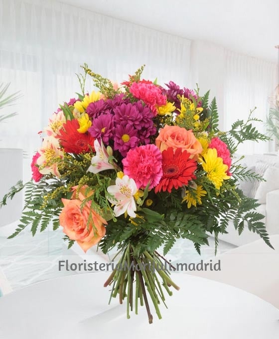 Ramo Flores Irlanda, bonito y alegre, realizado con rosas, claveles, gerberas, alstroemerias, margaritas, solidago, y con una variedad de tonos que le dan un aire muy alegre, especial para regalar a una persona a la que queremos ensalzar el ánimo y llenarle el día de alegría, y a su vez tiene una calidez excepcional. También le acompañan unos verdes, que ensalzan la belleza natural de este ramo de flores alegre y colorido. En nuestra floristería online puedes seleccionar entre nuestros arreglos florales las flores para regalar que más se ajusten a ti.