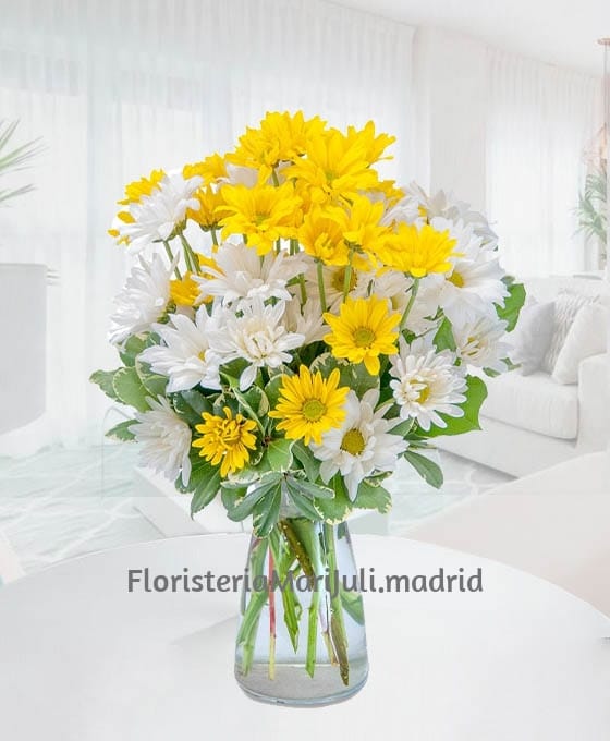 Alegre, bonito y fresco Ramo Flores Oslo en tonos amarillos y blancos. Si queremos alegrar el día a una persona, sin duda, es el regalo perfecto. Es un detalle bonito y especial que presenta nuestra Floristería Online. Un poco de nuestra naturaleza trasladado a un bonito ramo de flores. En este ramo, predominan las margaritas en tonos amarillos y blancos, todo ello decorado de una manera muy silvestre y primaveral. Nuestros ramos silvestres de regalo están realizados siempre con flores para regalar de primera calidad y frescas.
